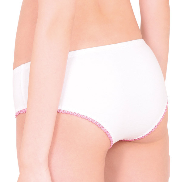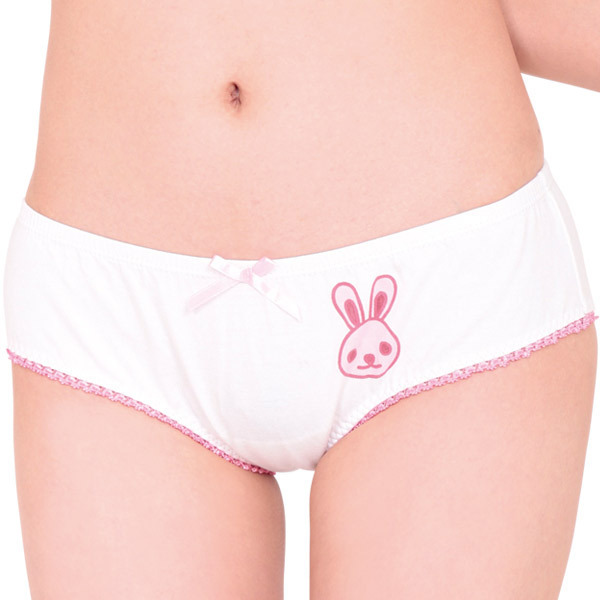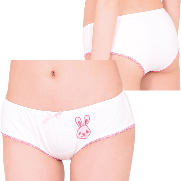 ●やさしい肌触りの綿混素材●フロントにウサギプリント●ちょこんと控えめなピンクリボン●脚ぐりをぐるりとピコットレースで加工●ヒップを優しく包むフルバック。