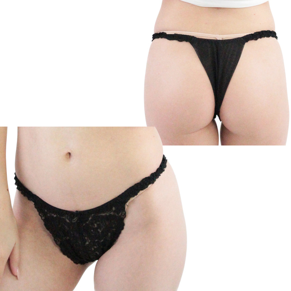 フロント部分をレースで華やかに飾った日本製のセクシーTバック(黒)。