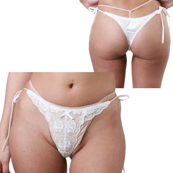 光沢生地にレース付き脇ヒモTバック Lサイズ ホワイト