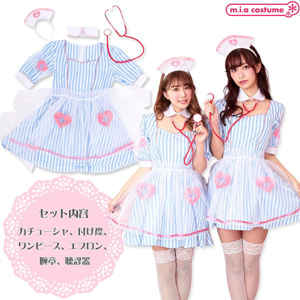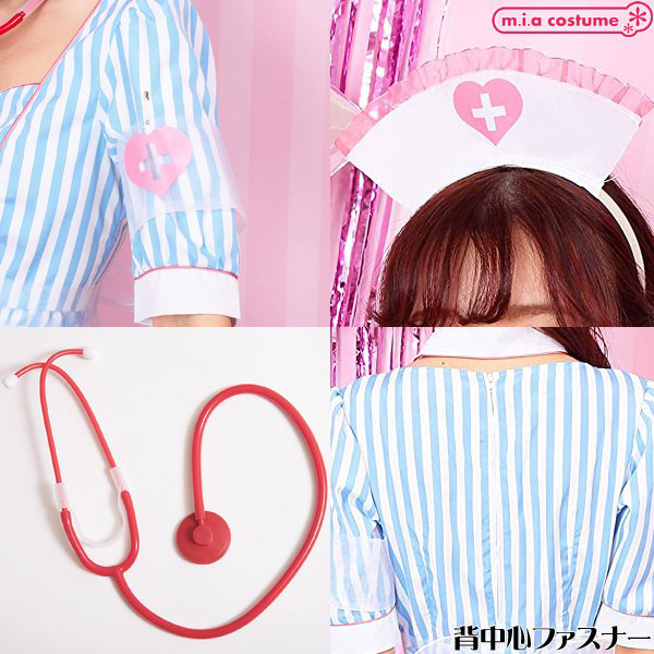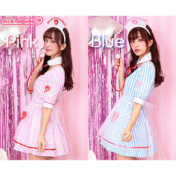 仮装コスプレのなかでもファッションにこだわりたいならこちら♪ストライプ生地にオーガンジーの透けた紋章とエプロンが可愛いブルーソーダナース(衣装)です。